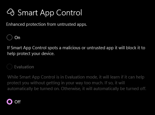 Smart App Control in Windows 11 may block or prevent certain applications from running, including components required for Sudden Attack.